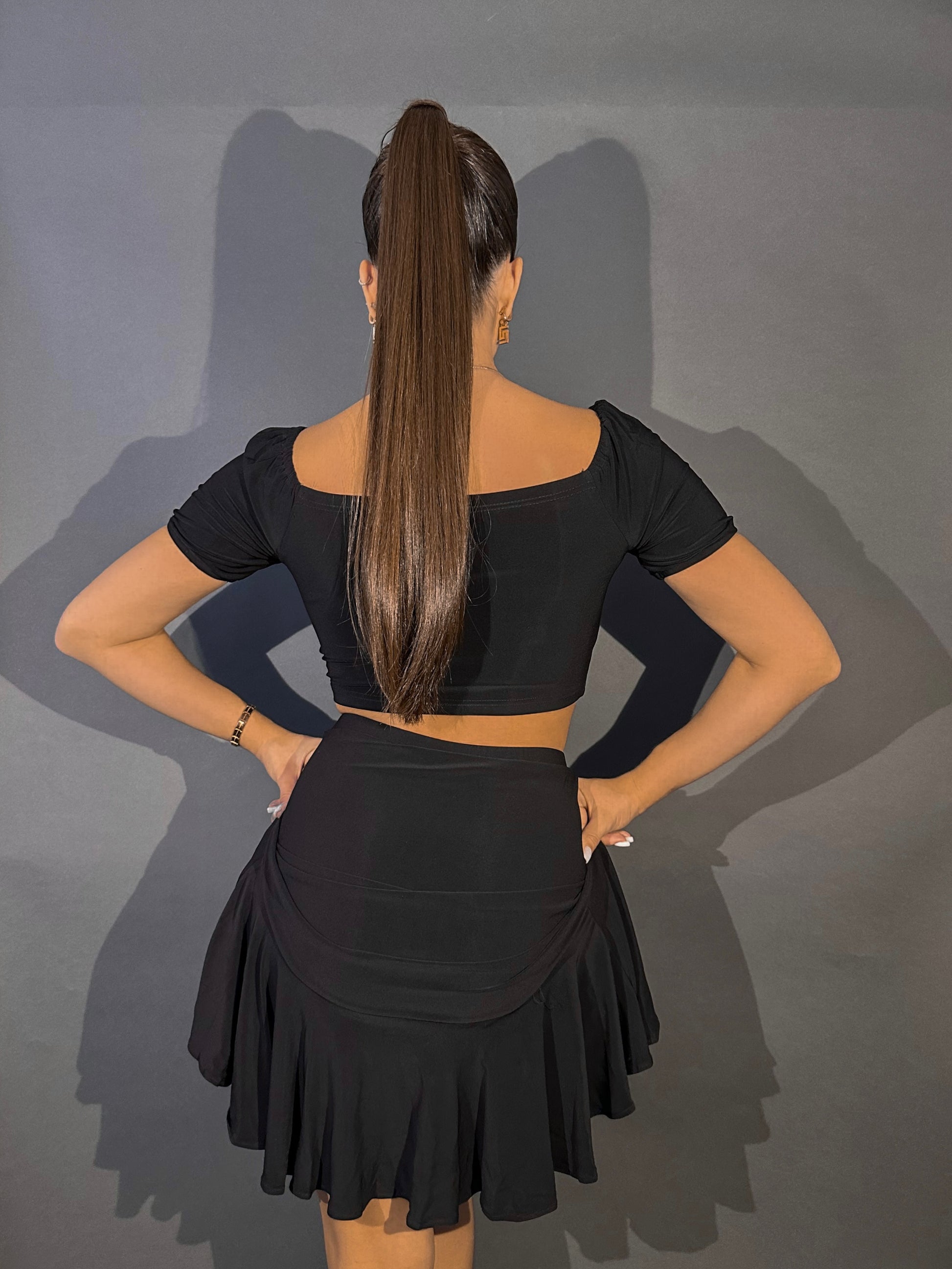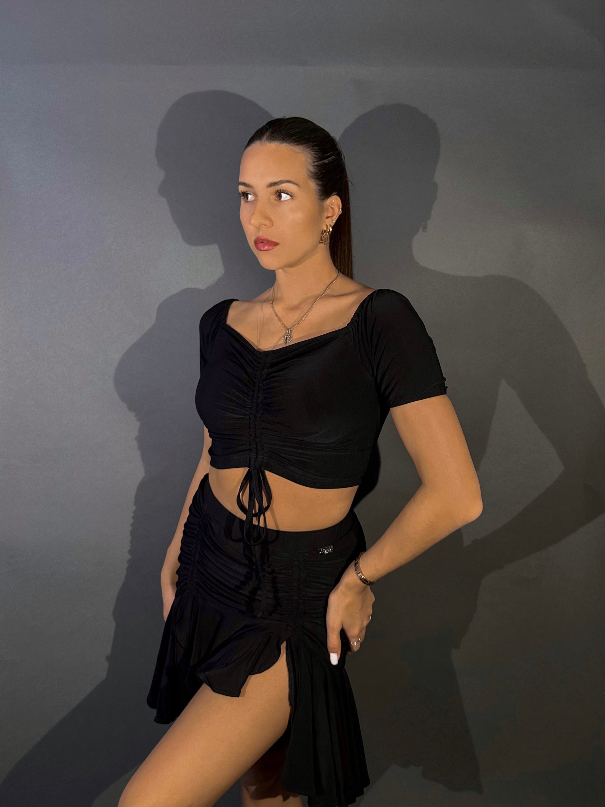 Experience the real Latin approach in our must-have Black Drawstring Crop Top. Designed for practice as well as for everyday life. Made from soft comforting material and includes bra cups. Match it with your Drawstring Skirt, just like the model on our photos.