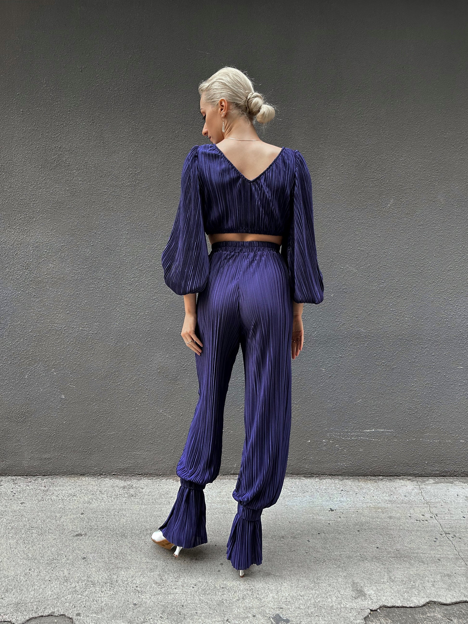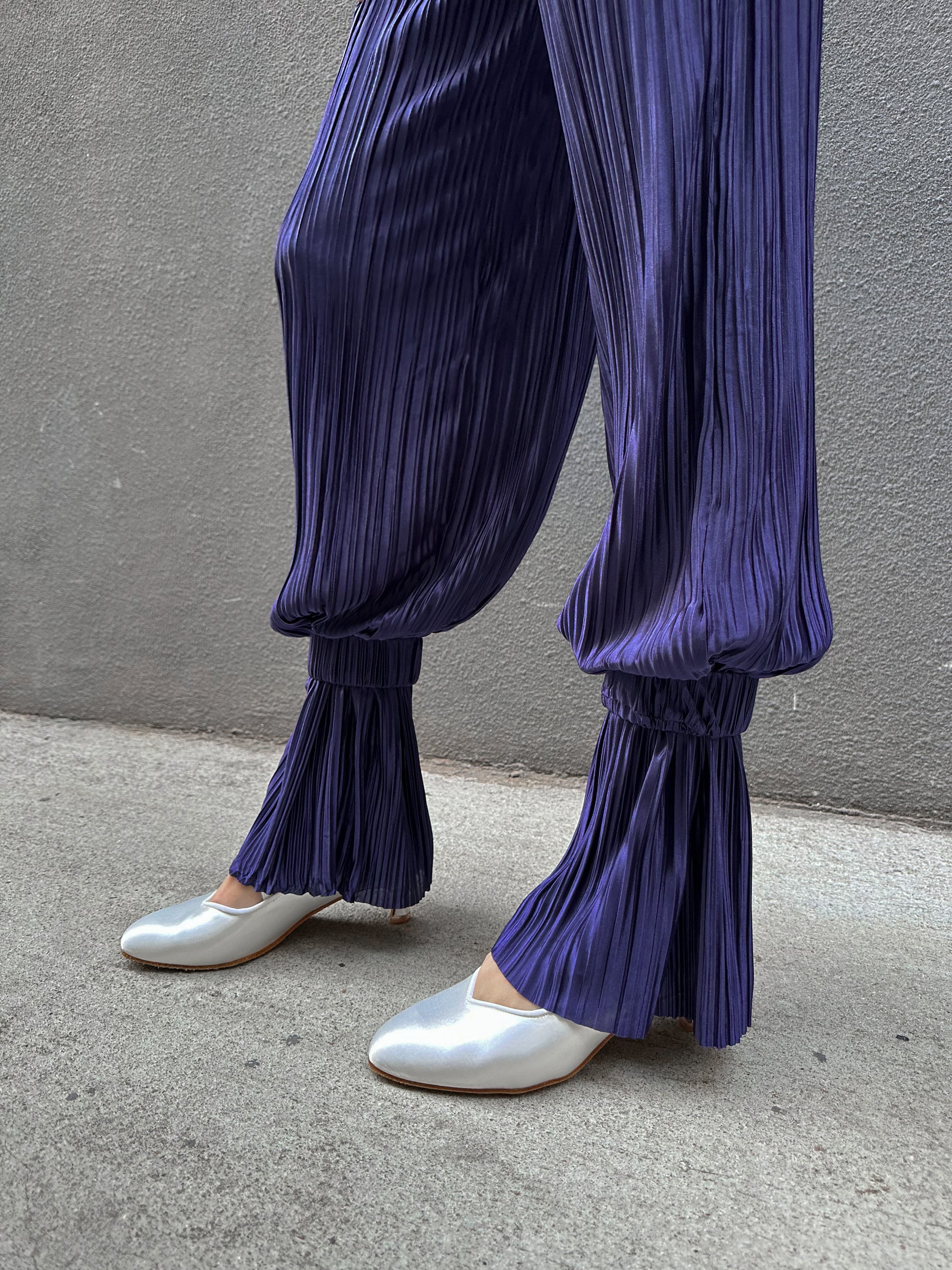 Navy Blue Satin Pleated Pants is an essential style with a twist suitable for your ballroom, smooth trainings or teaching or even a night out. Light and flowy material will make you feel comfortable yet luxurious. Goes great with our Satin Pleated Crop Tops in all colors. Fix the length on the pants with removable elastics according to your wishes.