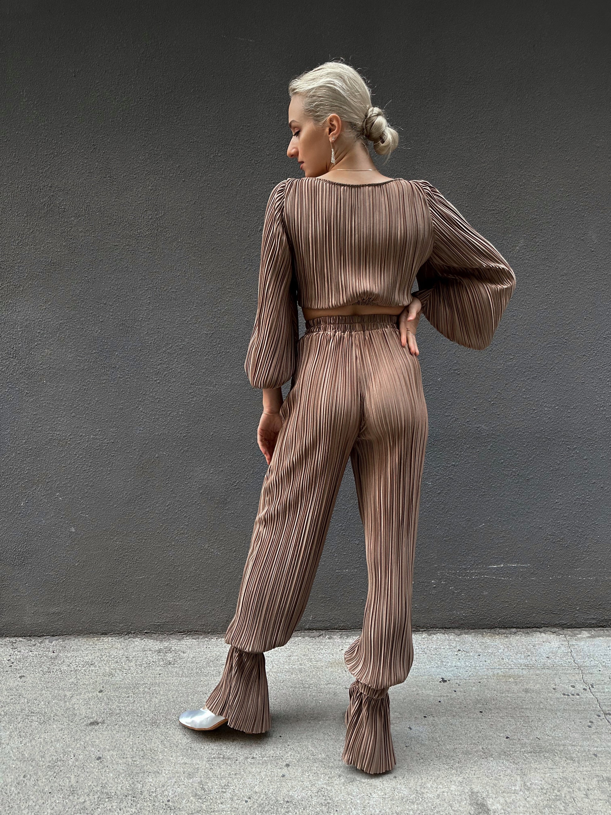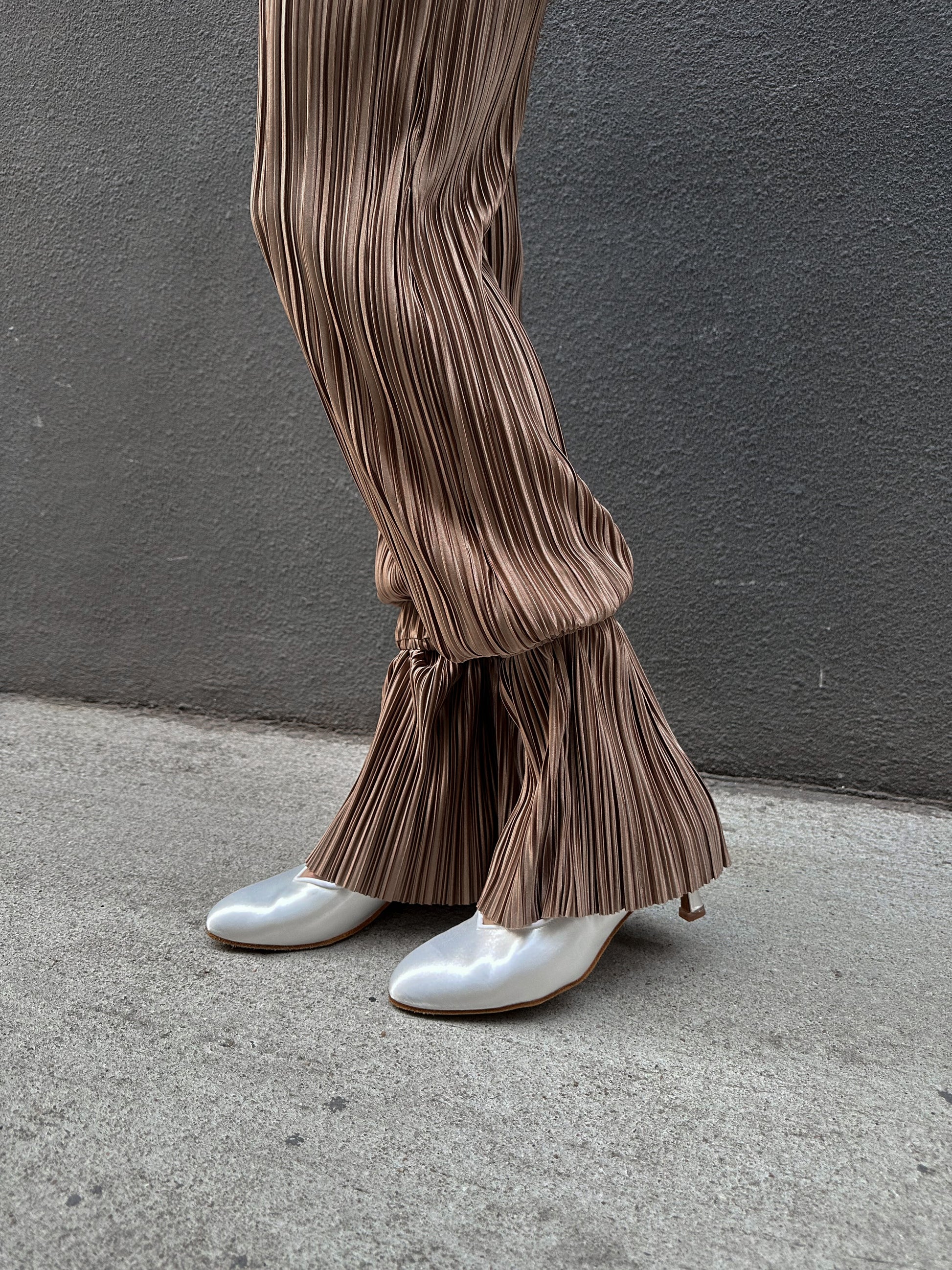 Beige Satin Pleated Pants is an essential style with a twist suitable for your ballroom, smooth trainings or teaching or even a night out. Light and flowy material will make you feel comfortable yet luxurious. Goes great with our Satin Pleated Crop Tops in all colors. Fix the length on the pants with removable elastics according to your wishes.