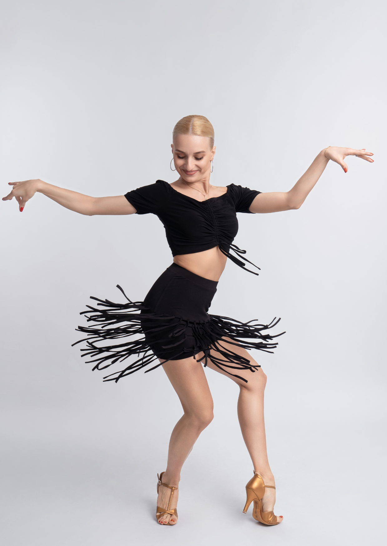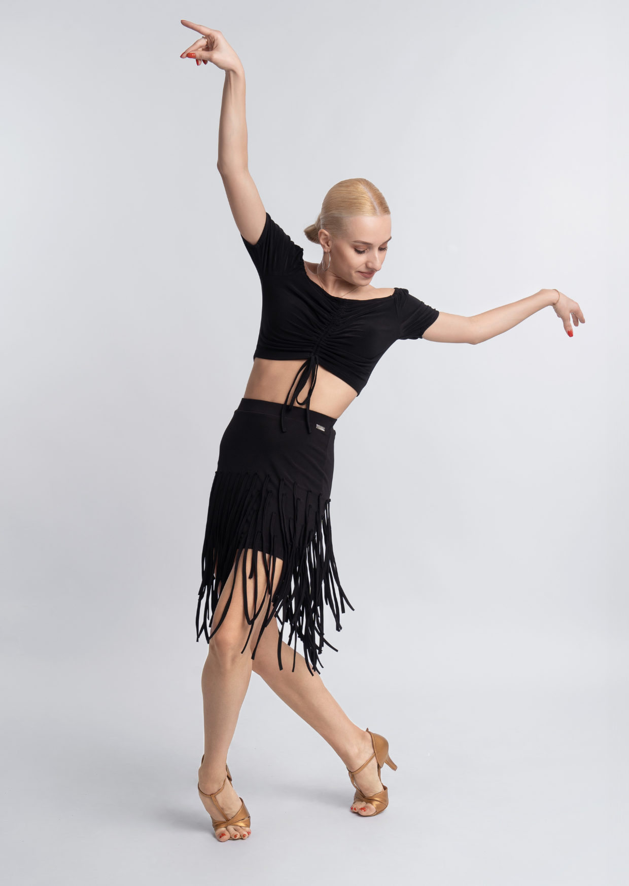 An unusual take on your daily latin look with our Dangle Skirt. Flying cords create a weighty flow while you turn. Classy style, yet with an interesting twist. This skirt has underwear attached for a flawless fit.